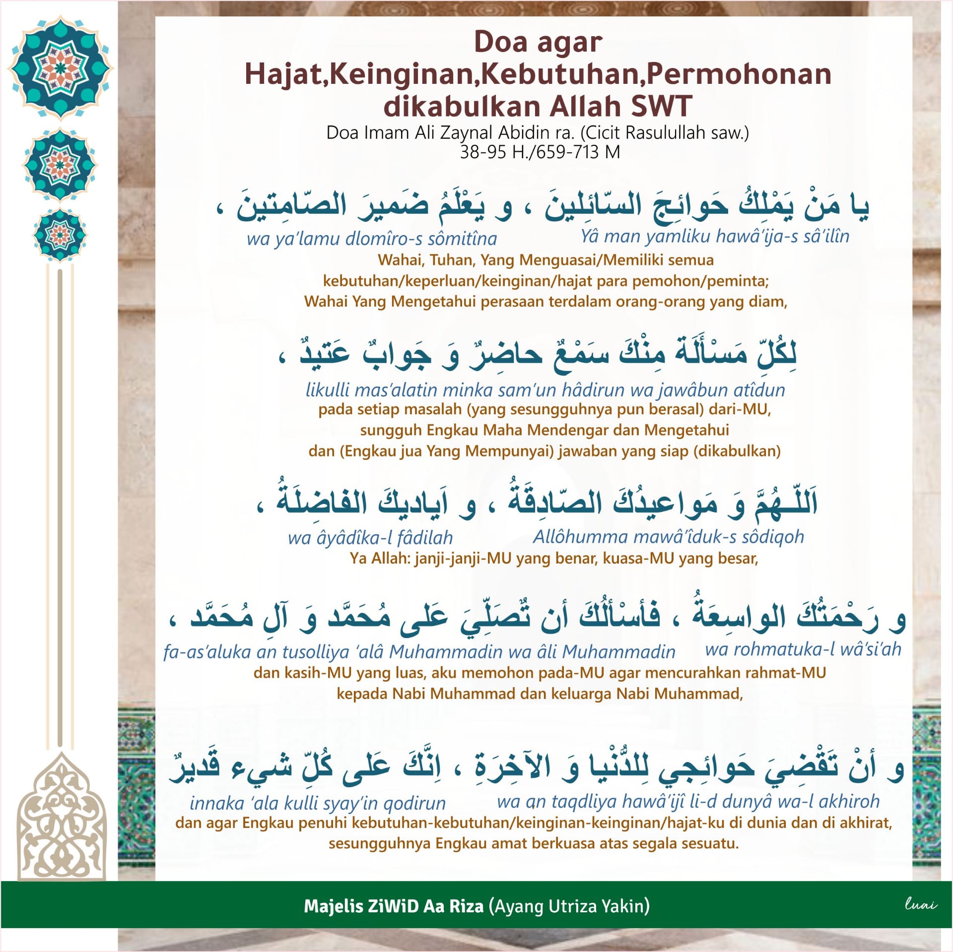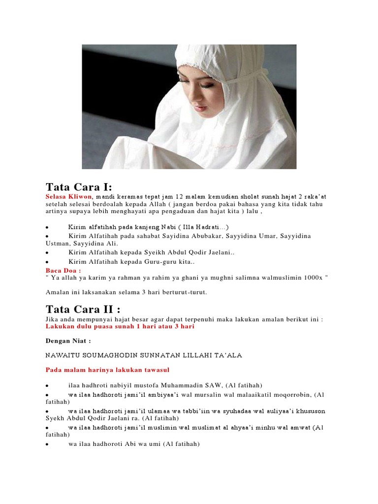 Tata cara doa sholat hajat agar harapan dan keinginan cepat terkabul january 2 2019 december 6 2018 by ikhsan sholat hajat sholat hajat adalah salah satu sholat sunnah yang diperuntukkan untuk seseorang yang sedang memiliki suatu hajatkeinginan maupun suatu masalah yang ingin diselesaikan. Baca doa ini agar hajat dunia akhirat selalu terpenuhi. Selain melaksanakan salat hajat saat memiliki keinginan tertentu, anda bisa membaca doa yang diajarkan rasulullah saw agar keinginan dipenuhi oleh allah swt. Kemudian utarakan apa hajat anda.insya allah dgn pertolongan nya hajat anda akan segera terpenuhi. Ilaa hadhroti nabiyil mustofa muhammadin saw, (al fatihah) wa ilaa hadhoroti jami'il ambiyaa'i wal mursalin wal malaaikatil moqorrobin, (al fatihah) wa ilaa.