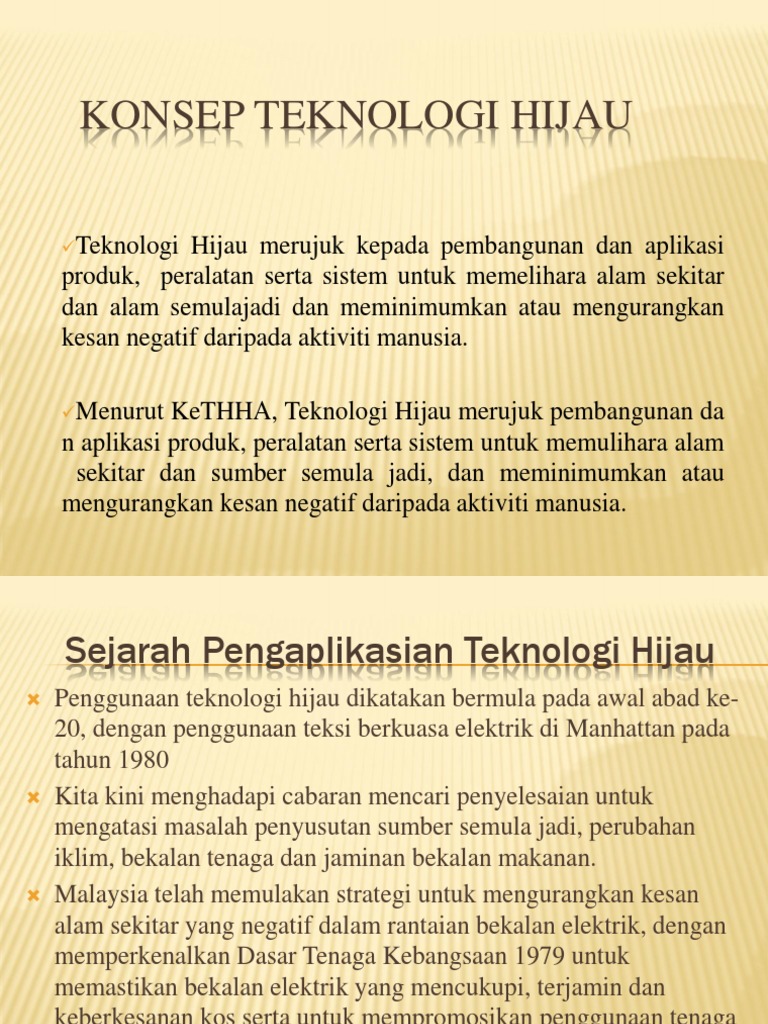 Pembangunan mampan adalah teras kepada teknologi alam sekitar yang bermaksud penyelesaian perlu mengambil kira aspek sosial, ekonomi dan alam sekitar. Penggunaan tenaga yang lebih cekap. Teknologi hijau merujuk pembangunan dan aplikasi produk, peralatan serta sistem untuk memelihara alam sekitar dan alam semulajadi dan meminimumkan atau mengurangkan kesan negatif daripada aktiviti manusia. 2018 sebanyak 319 projek memperoleh manfaat daripada skim pembiayaan teknologi hijau (gtfs) sepanjang tempoh 2010 sehingga 31 december 201. Seperti kita semua sedia maklum, pemanasan global dikaitkan dengan kenaikan suhu dunia.