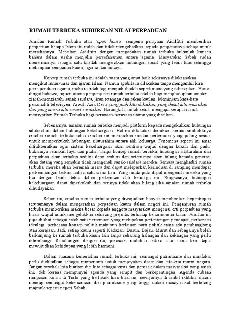 Laman bahasa melayu spm karangan kepetingan rumah terbuka di malaysia. Kebaikan amalan rumah terbuka kepada rakyat malaysia. Bagi penganut kristian perayaankrismas atau hari natal disambut dengan meriahnya di seluruh negara.amalan rumah terbuka yang diwujudkan memberi banyak kepentingan terutamanyadalam mengeratkan perpaduan kaum dalam kalangan anggota masyarakat di negara kita.perpaduan yang terjalin sekaligus dapat memudahkan pencapaian matlamat atau misi dan visinegara dalam usaha untuk menjadikan malaysia sebuah negara bangsa. Karangan rumah terbuka ting 5 docx. Semasa menghadiri rumah terbuka tersebut para tetamu yang hadir akan beramah mesra dengan tetamu yang lain.